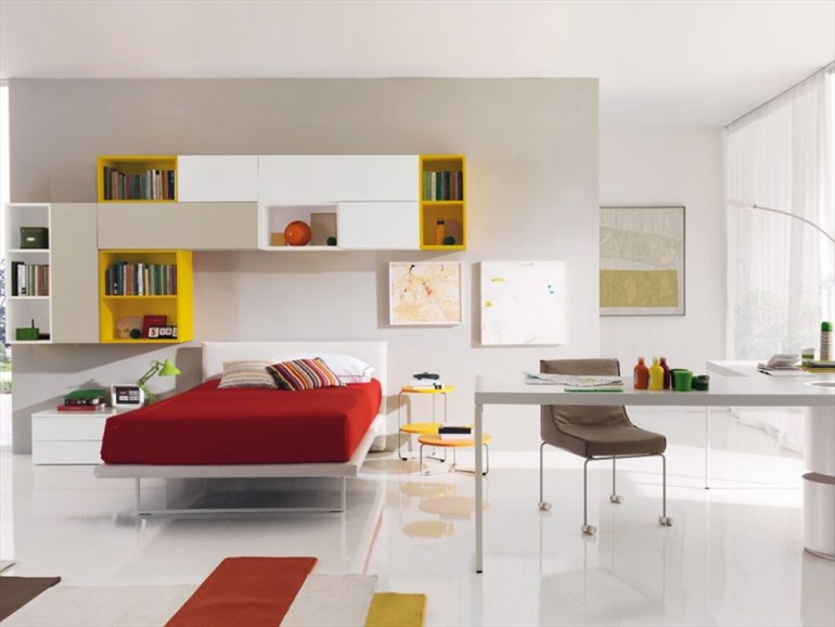 Set for kids room from Italian manufacturer Zalf. Design in modern style. The set includes: single bed, Desk, modular system for books and bedside Cabinet. Furniture made from solid wood and painted metal. Colors: white, yellow, red.