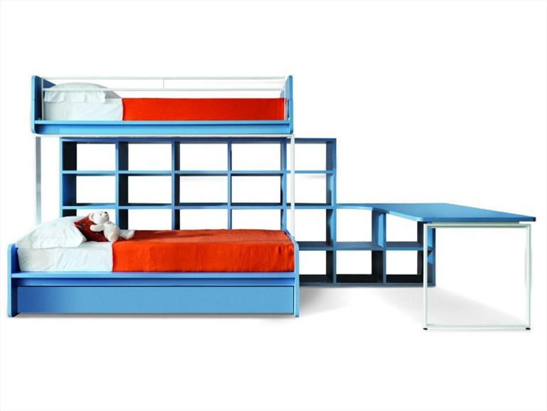 Bunk bed Castello di Robin from the Italian manufacturer Zalf. The frame is made from solid wood and metal. The surface is treated with varnish from the range of the factory. The model is equipped with drawer storage, open shelves and built-in Desk. Design in modern style. Colors: white, red, blue.
