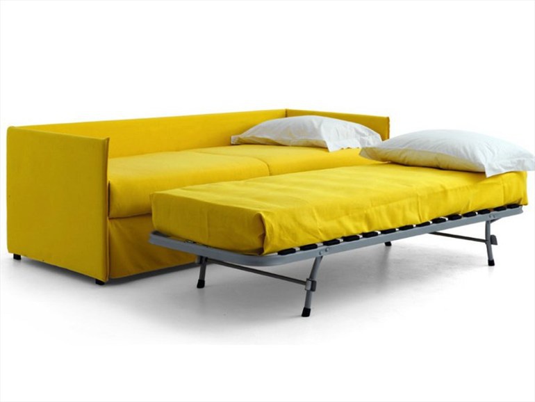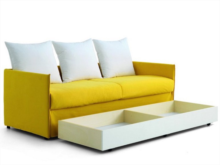 Sofa bed Bino from the Italian manufacturer Zalf. The frame is made from solid wood, removable upholstery - cloth from the assortment. Filler - polyurethane foam. The model is equipped with a drawer for storage. The design of complementary decorative pillows. The style is modern. Product color yellow.