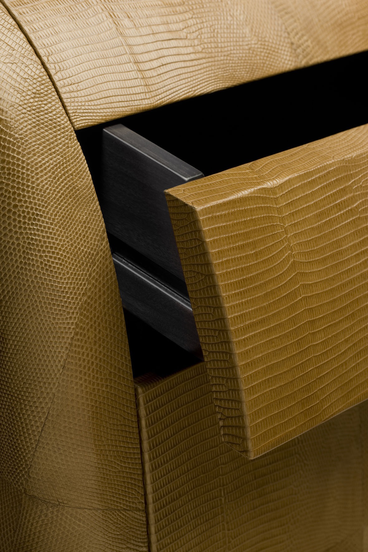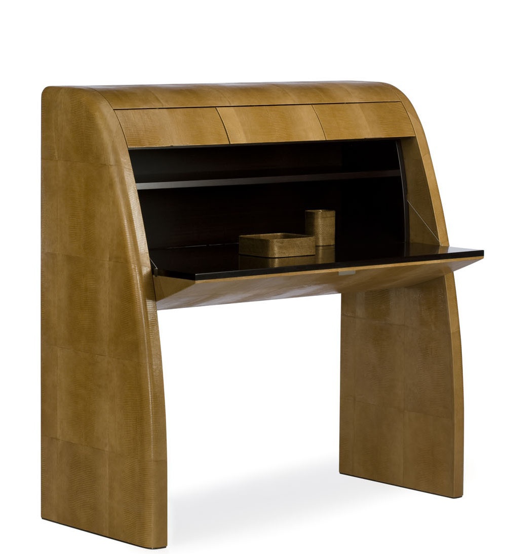 Secretaire Camus, from the Italian manufacturer Armani Casa. The external lining is made of lizard skin, interior of drawers and Desk made of wood with a matte veneer of rosewood. System opening convertible top is made using a special coupling device, which slows down the opening and a sudden drop. Design solution for Cabinet in modern style.