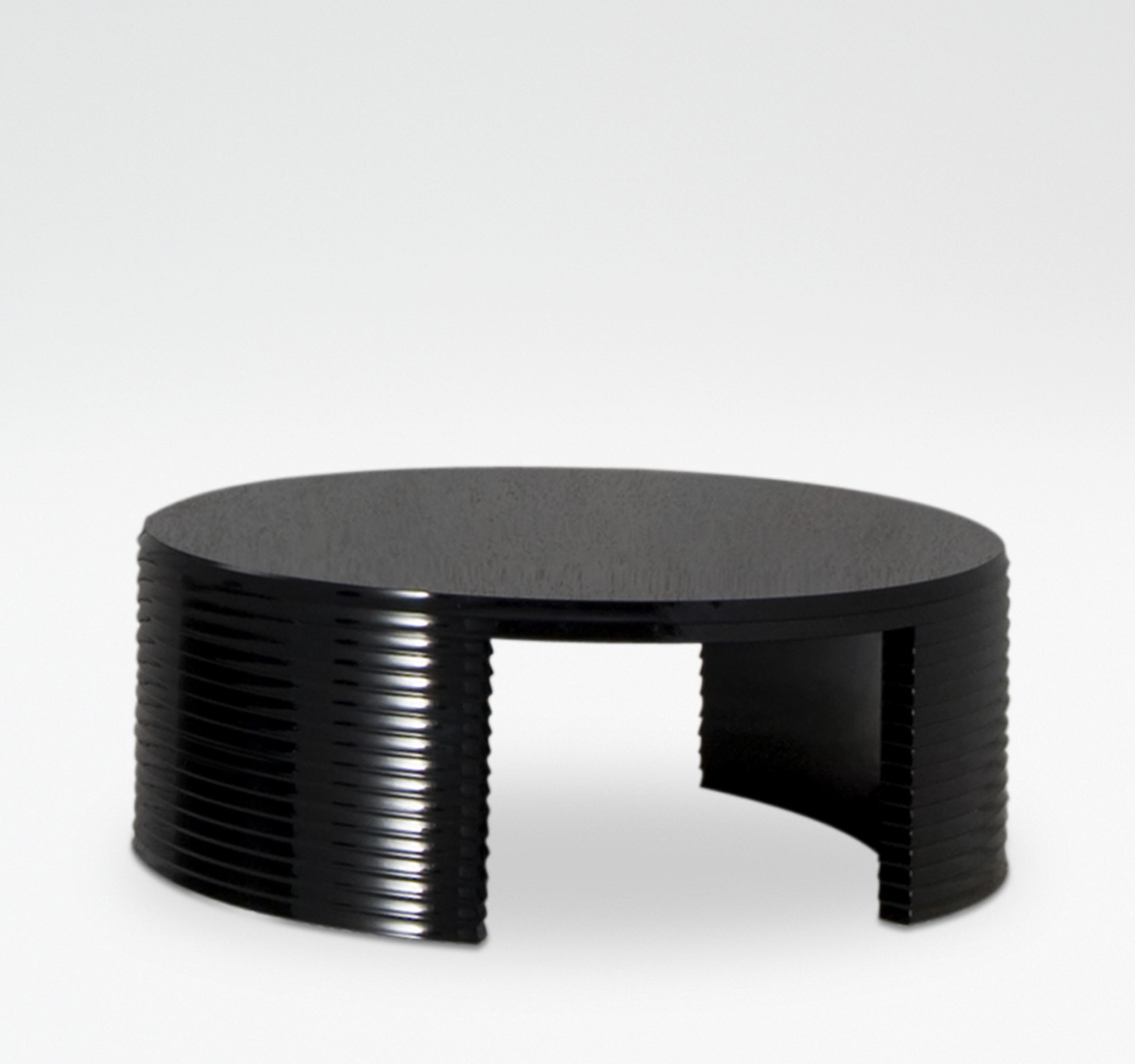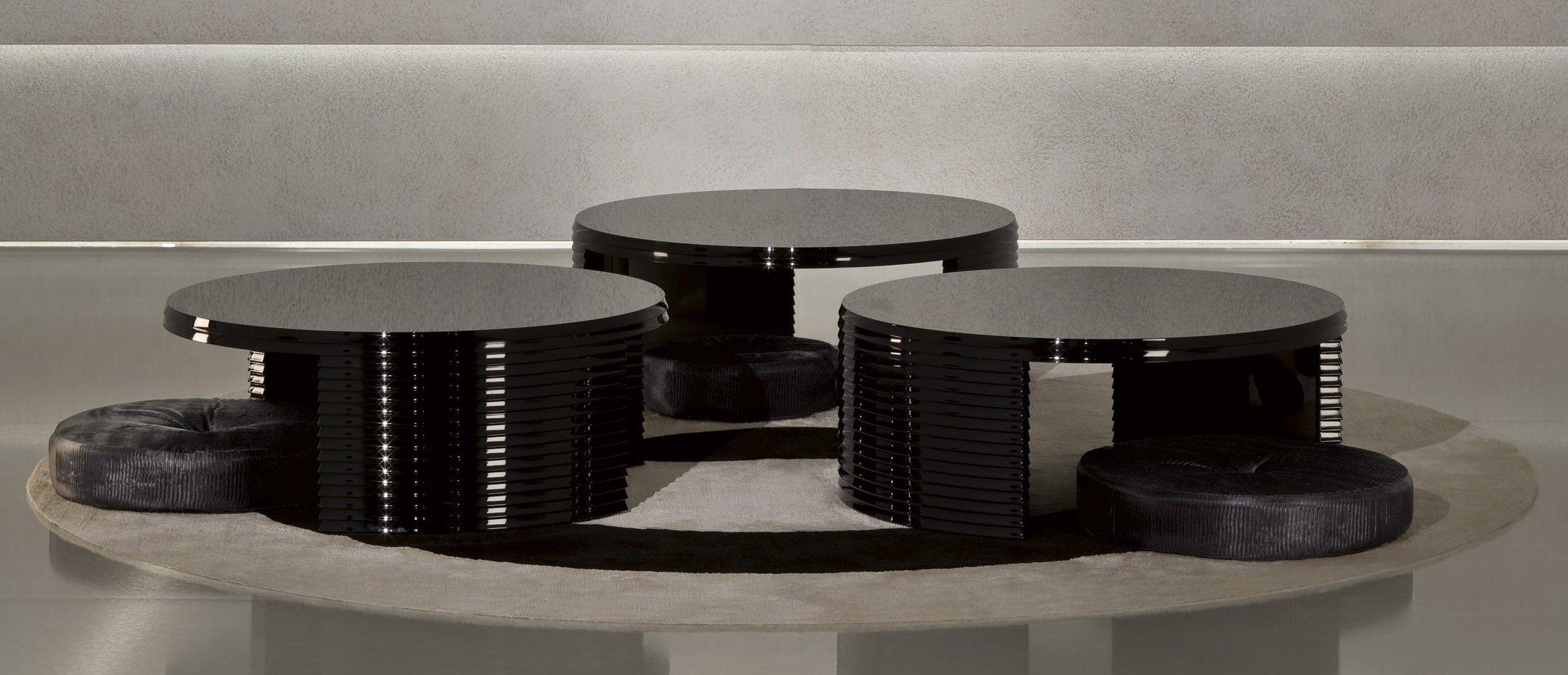 Coffee table Bussola, an Italian manufacturer of Armani Casa. The frame is made from solid wood. The round table finished with high gloss varnish. Top supported by two semi-circular legs. The style is modern.