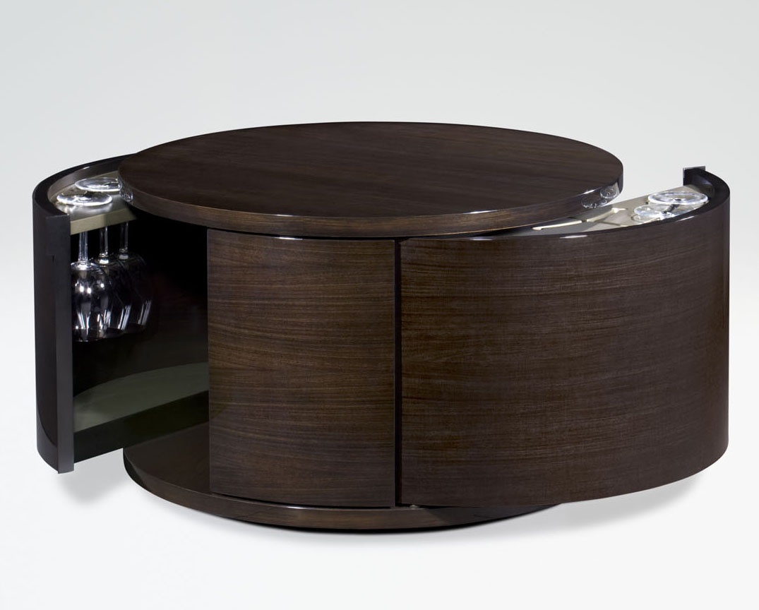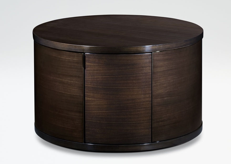 Circle table from the Italian manufacturer Armani Casa. Model round shape. The body is made of wood. The finish offers a glossy varnish. Accessories metal. Distinguished elegance and practicality.
