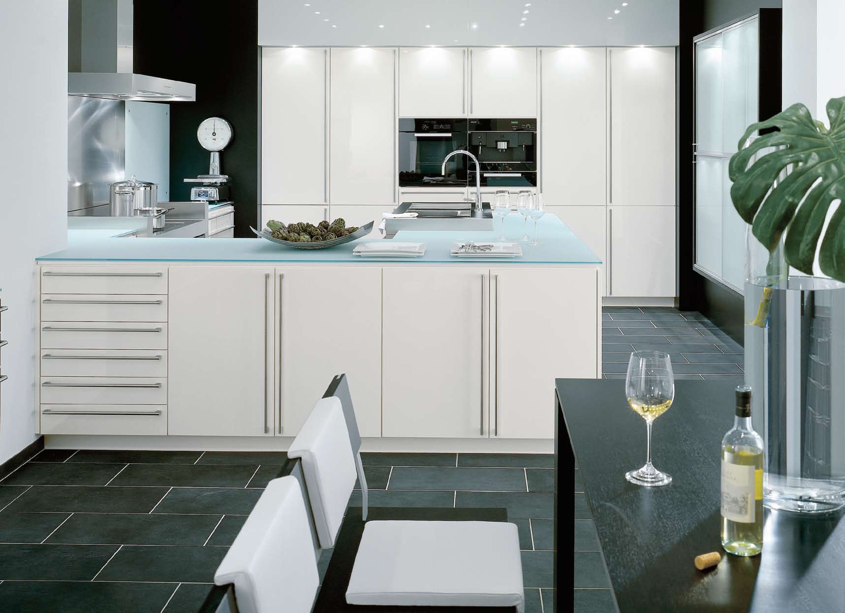 From German kitchen manufacturer Zeyko. The body is made of solid wood. Finish - white lacquer. Working area - the glass. Handles are metal. Headsets are equipped with built-in lighting. Elegant fit into the interior in high-tech style.