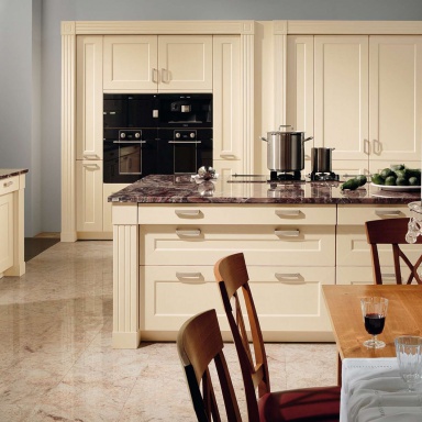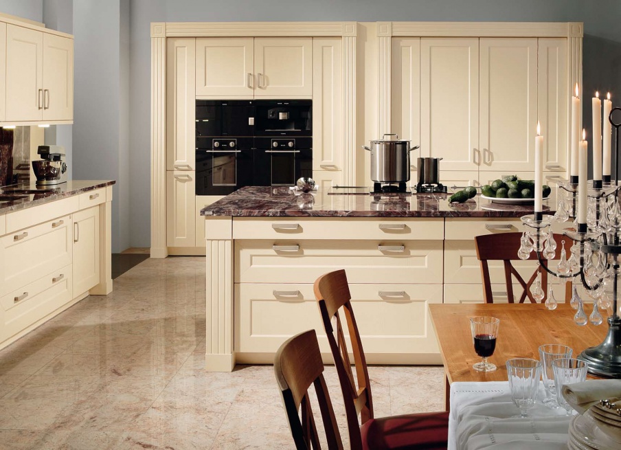 Set for the kitchen from the German manufacturer Zeyko. The case is made of natural wood. The surface is treated with varnish from the range of the factory. Working area - natural stone. Handles - metal. Headsets are equipped with hinged doors, drawers and built-in lighting. Style classic. Colours in stock.