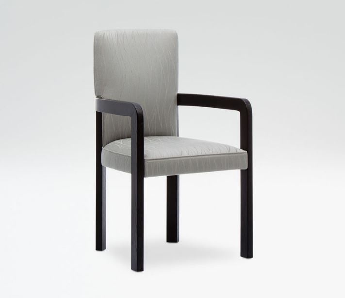 The chair of Elodea, from the Italian manufacturer Armani Casa. The frame is made from solid oak, mahogany. Upholstered in textile or leather from the company portfolio. Model with curved armrests. Filling of the seat and backrest made of polyurethane foam of different thickness. Colours - grey and dark brown.