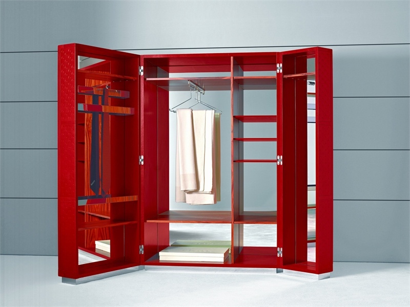 Wardrobe Condotti from the Italian manufacturer Flou. The frame is made from solid wood in the finishing of leather. The rear wall of the Cabinet and the inside of the door mirror. Inside there are racks, steel height-adjustable wooden shelves. Model wardrobe for bedroom in a modern style. Product color red.