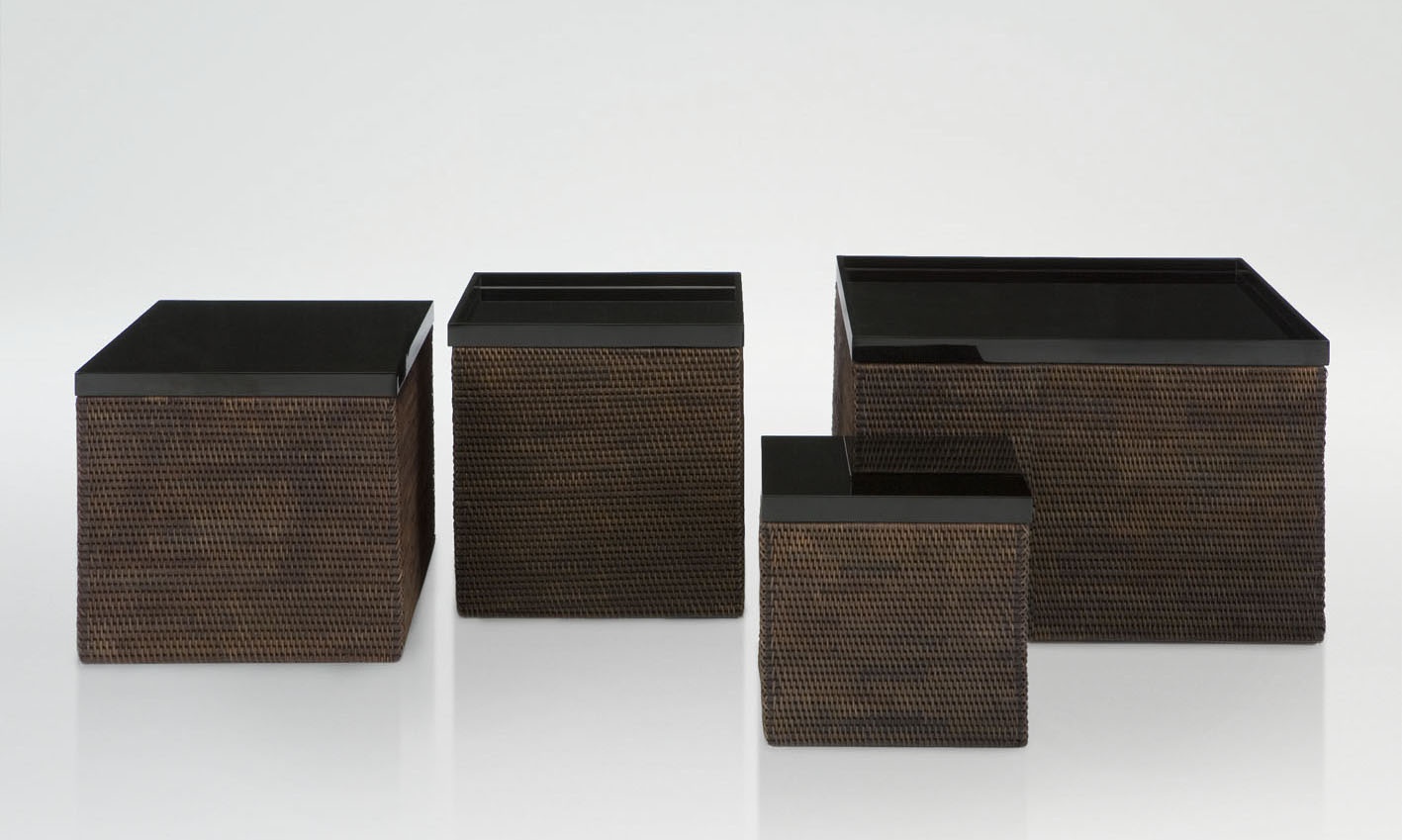 Poof Tembo, from the Italian manufacturer Armani Casa. The frame is made of rattan, countertop covered with black lacquer. Colors - brown and black. The style is modern.