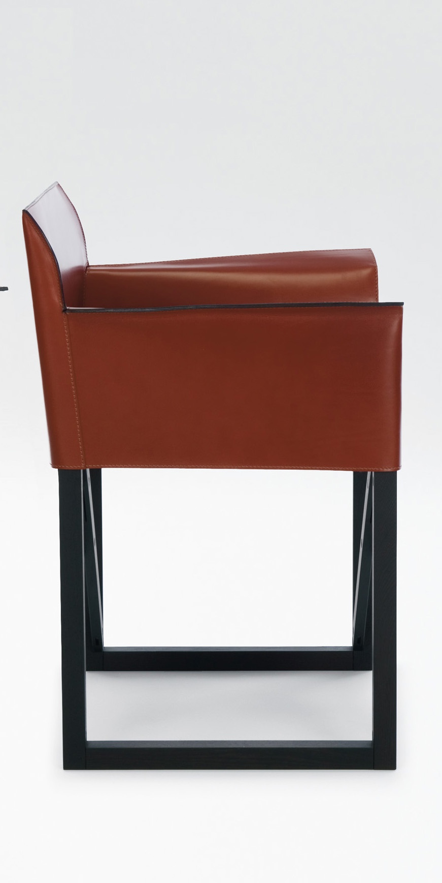 Chair Truffaut, from the Italian manufacturer Armani Casa. The model is awkward. The structure is made of solid wood wenge. Leather seat and back red, black, or gray. The insert is made of brushed black metal. The chair will perfectly fit into modern interior.