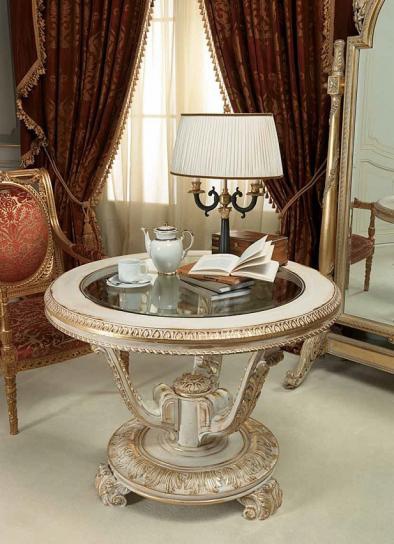 Magazine/coffee table from the Italian manufacturer Vimercati. The frame is made from solid wood, round top clear glass. The model is decorated with carved decoration. Finish options range from the factory. Handmade. A chic choice for interior in classic style. Colours in stock.