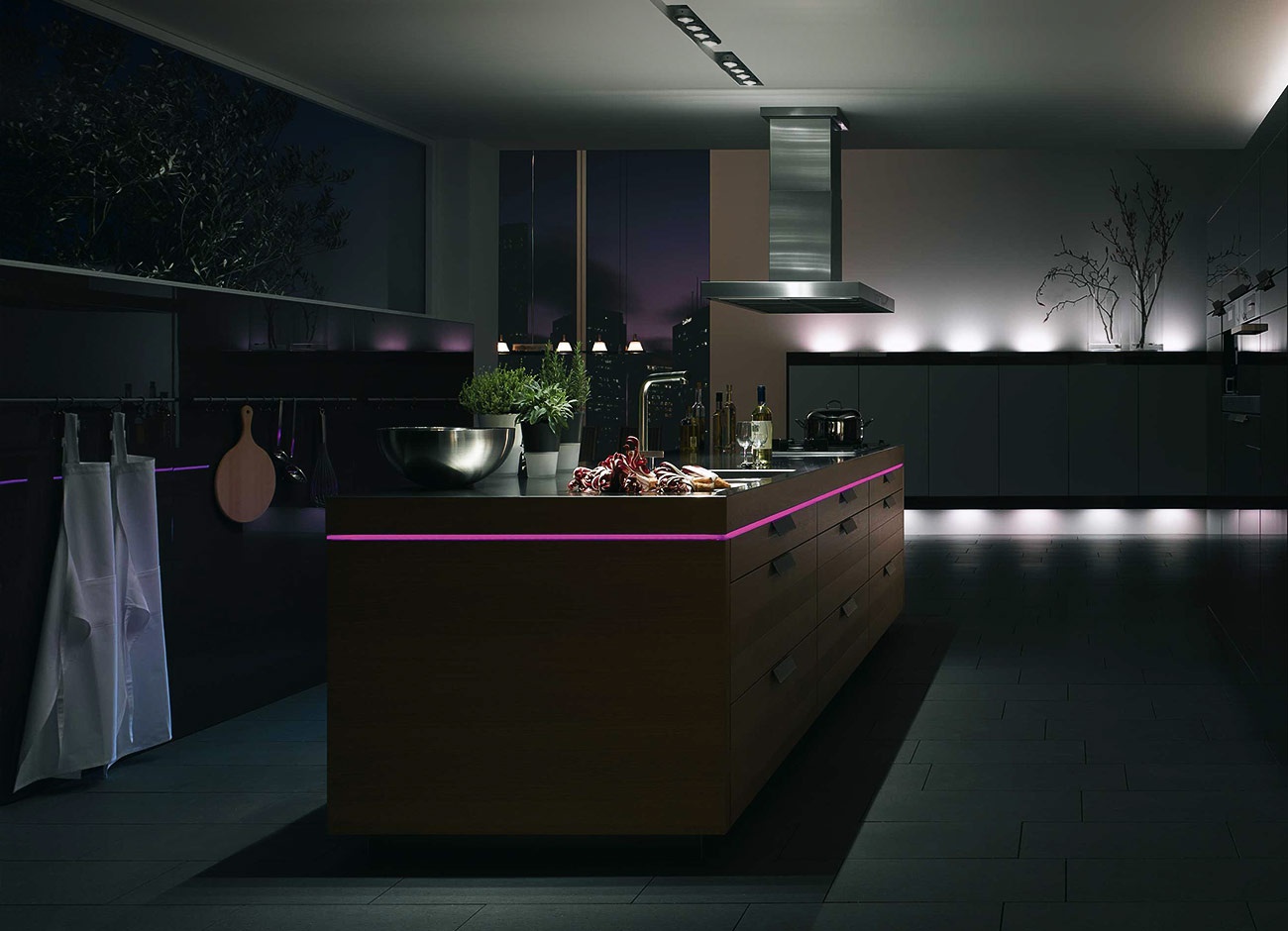 Kitchen set Island of Light, from German manufacturer Warendorf. The model is made from light oak with a high gloss finish. The facades ottenere adjustable backlighting. A flexible system of space made of light beech. The drawers and closets are lit by LEDs.