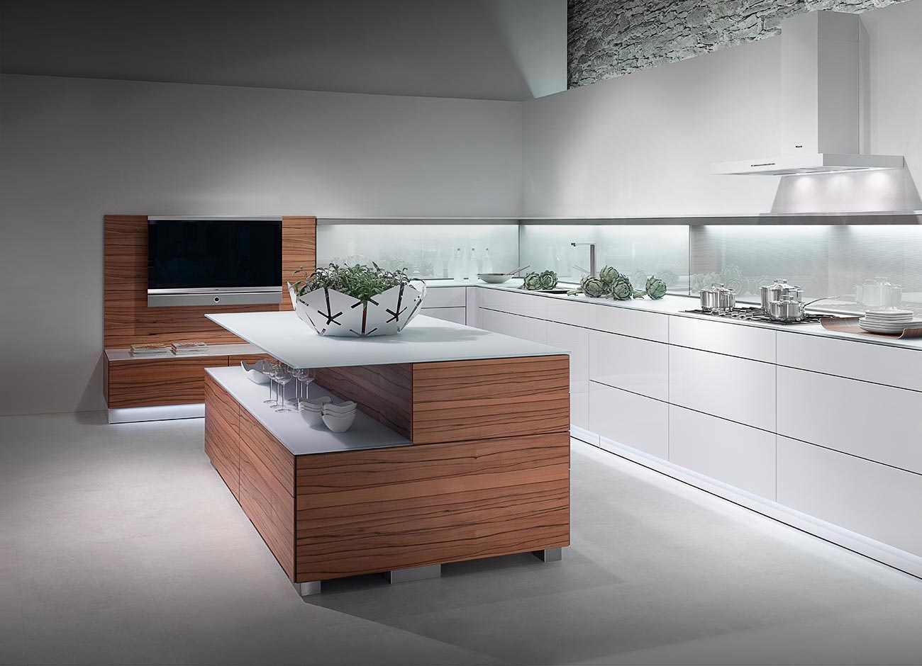 Kitchen set Futuristic, from German manufacturer Warendorf. Material - wood. Finishing - veneer Tineo. Bench with back wall to create a cozy TV area. Sliding elements are motorized. Colors - brown and white.
