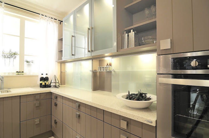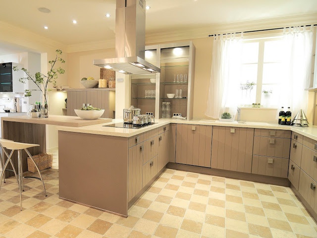 Kitchen set, from a German manufacturer called Stormer Kuchen. The model is in a corner shape, with the addition of a handy bar. Contains mounted and floor storage. The door is made of frosted glass or wood, with metal fittings. Izyskannyi gobalet decorative vertical stripes. Solemnize made of stone. The style is modern.