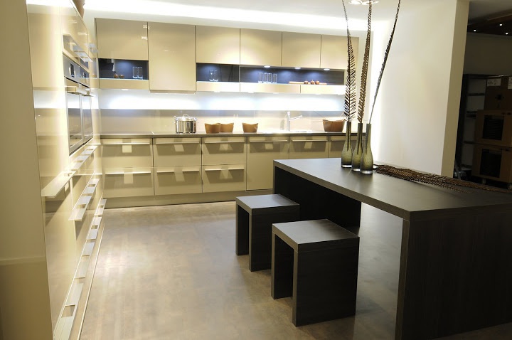 Kitchen set, from a German manufacturer called Stormer Kuchen. The corner model consists of mounted and floor systems. Finish - gloss lacquer beige. Kitchen can damnit the massive dining table in a contrasting color. Open section lit svetodiodov. The style is modern.