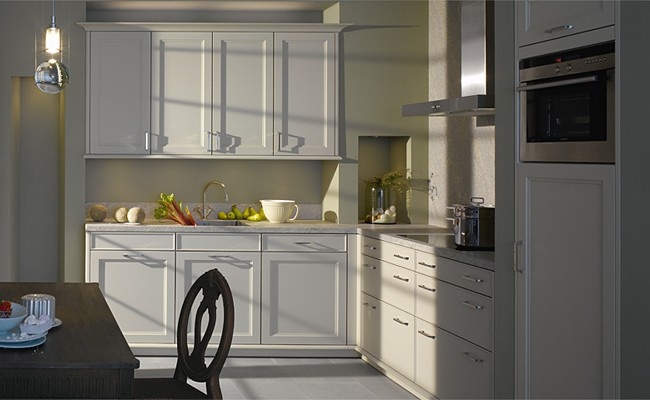 BeauxArts kitchen cabinets from German manufacturer SieMatic. Corner Suite designed in a neoclassical style. Ottley - gloss lacquer white and beige. Cooktop - glass-ceramic. The table top is made of stone. Oven hidden in tall wall Cabinet.