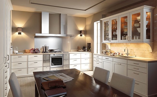 BeauxArts kitchen cabinets from German manufacturer SieMatic. The model is made in classic style. Finish - gloss lacquer white. Set consists of a variety of cabinets and storage. The table top is made of stone. Fittings - metal. Shelves and hinged door system durable glass.