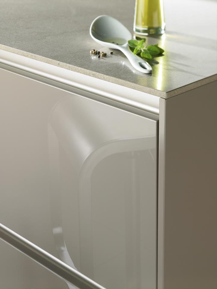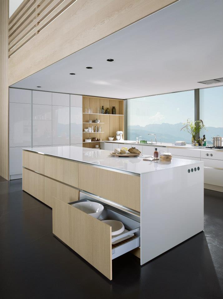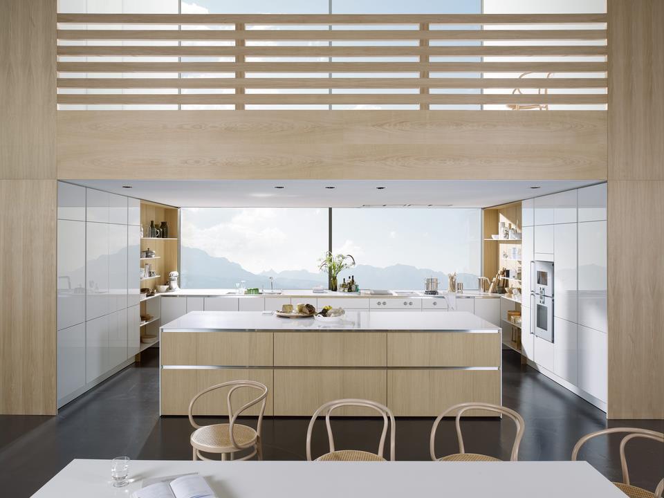 Kitchen set S2, from German manufacturer SieMatic. Working surface made of stainless steel. Facades - gloss lacquer and wood veneer. The model is made asymmetrically at the left and right side there are massive cabinets in white finish, creating easy and open shelving. Set is made in modern style.