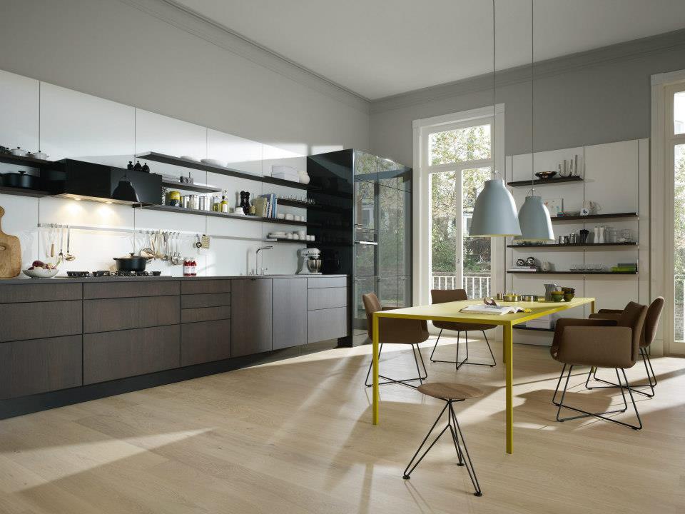Kitchen SE4004, from German manufacturer SieMatic. The table top is made of stone. Facade finish - Matt lacquer and veneer wood. The hob is lit by LEDs. Colors - brown and black. Set is made in modern style.