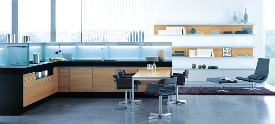 Kitchen cabinets from German manufacturer Poggenpohl. The angular model is made in a modern style. The working surface illuminated by the LEDs. The hob is made of glass ceramics. Fittings - metal. Finishing varnish from the company portfolio. Colors - brown and black.