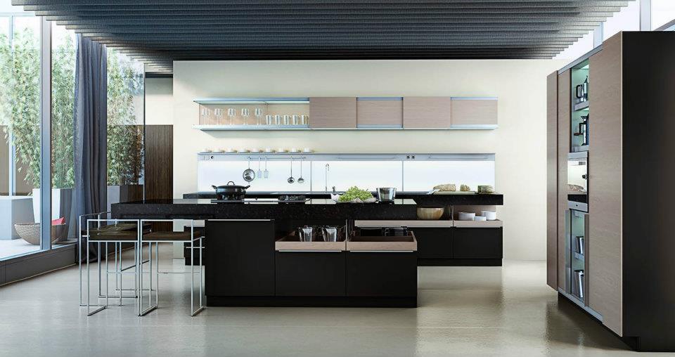 Kitchen cabinets from German manufacturer Poggenpohl. The island contains a Breakfast bar and cooktop. The table top is made of stone. Facades - gloss varnish. The dark lines of the blocks blended with delicate lighting. Set is made in modern style.
