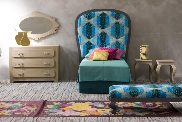 Double bed from the collection of Gingerbread, from the Italian manufacturer Lando. The frame is made of wood. Finishing varnish from the company portfolio. The model is made with high headboard and soft upholstered textiles. Colors blue and blue.
