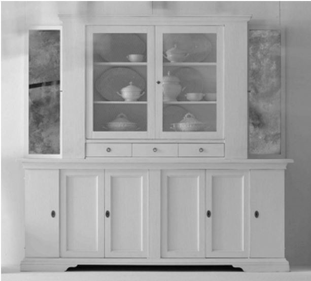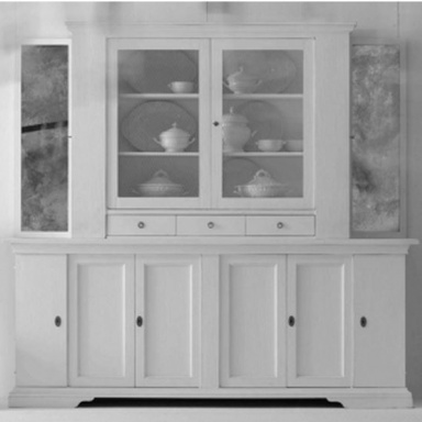 The buffet of the Nuova Falegnameria collection from Lando Italian manufacturer. The frame is made of wood. Finish - Matt lacquer white. The model consists of sections with convenient shelves and drawers with metal hardware. The style is classic.