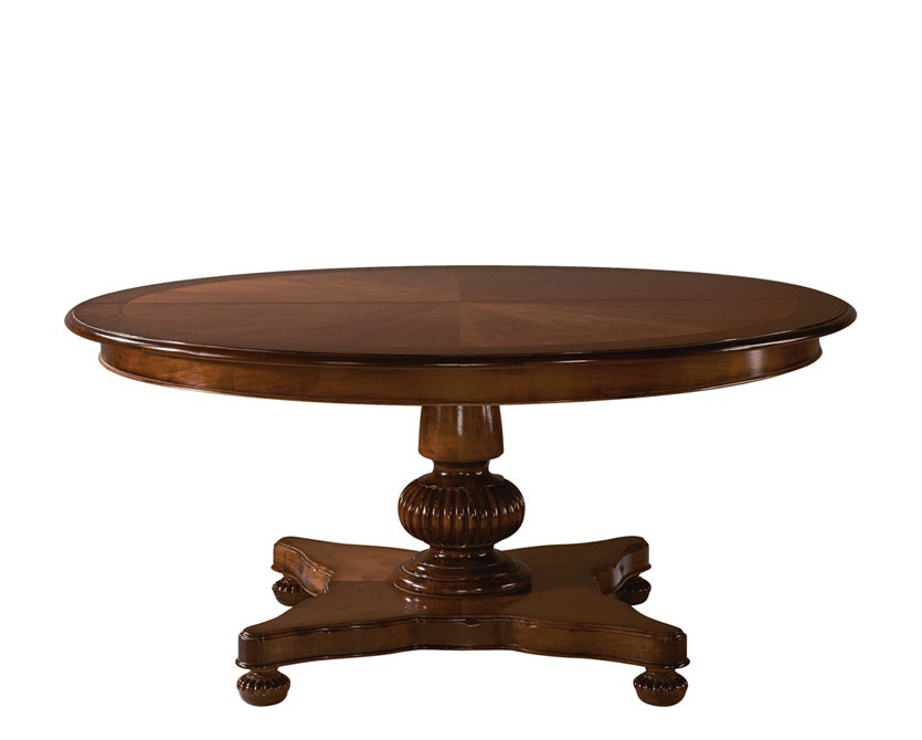 Table Regency Dining Table from the American manufacturer Baker. Model on massive carved leg handmade. Countertop round shape. The surface is covered with a glossy varnish. Made of mahogany (mahogany). Classic design. Color in stock.
