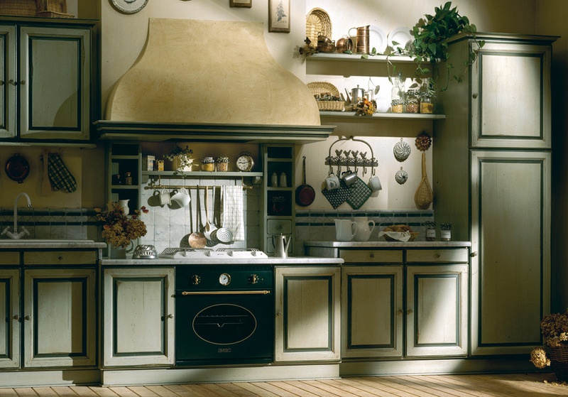 Set for the kitchen Granduca from the Italian manufacturer Marchi Group. The model includes lockers with hinged doors and open shelves. The Cabinet is made of solid wood. Finish the catalog of the company. Accessories metal. The working surface is covered with marble. Pen boxes made of metal.