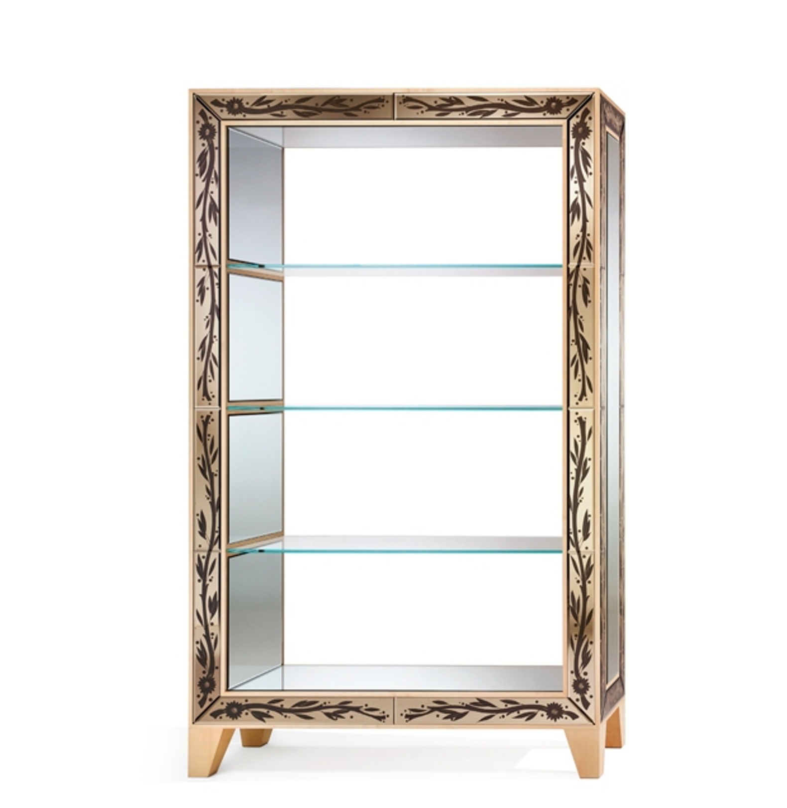 Showcase of the Italian manufacturer Arte Veneziana. Model for small feet made of wood with open glass shelves. The edges of the storefront are decorated with a manual carving.