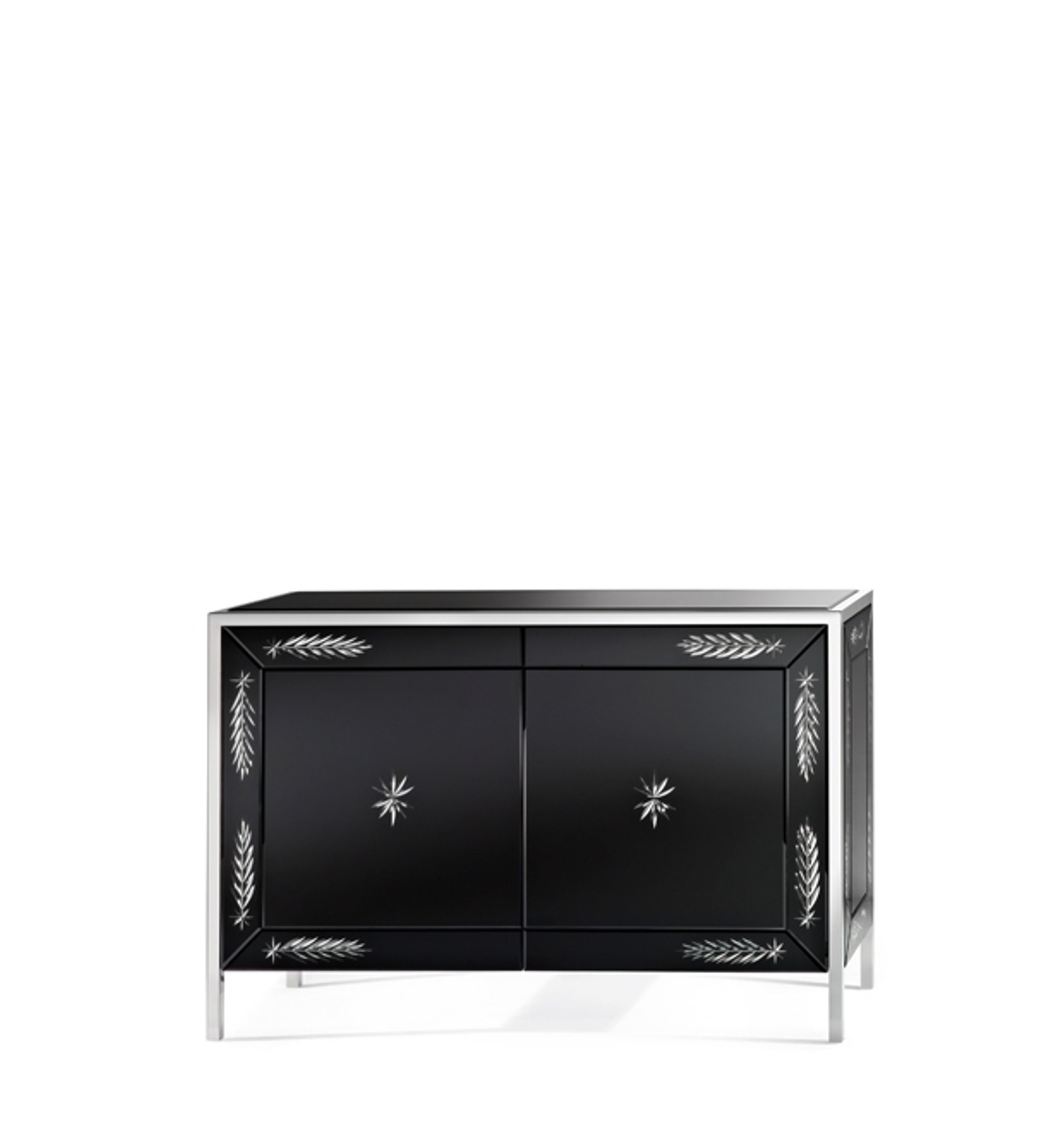 Chest of the Italian manufacturer Arte Veneziano. Rectangular chest of drawers on small feet made of metal. Model in black color with steel patterns. Made in a modern style.