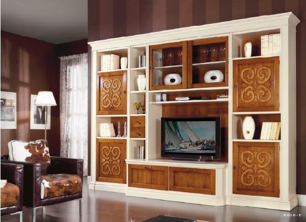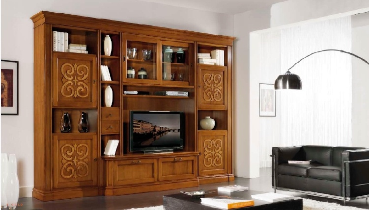 Modular system from Italian manufacturer Lubiex. Includes closed and open shelves and drawers. There is a place for TV. Finish - white or brown. Accessories metal. Sash glazed and deaf. The model is made in a modern style.