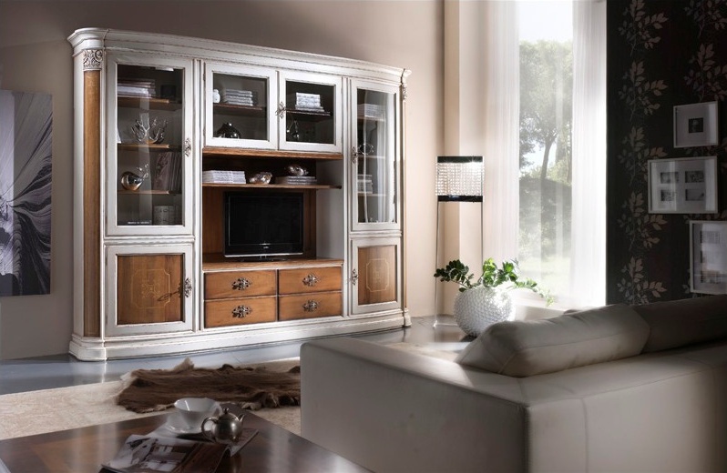 Modular system from Italian manufacturer Lubiex. The model is made in a modern style. The body is made of solid wood. The surface of the varnished white and brown. Sash glazed. Accessories metal.