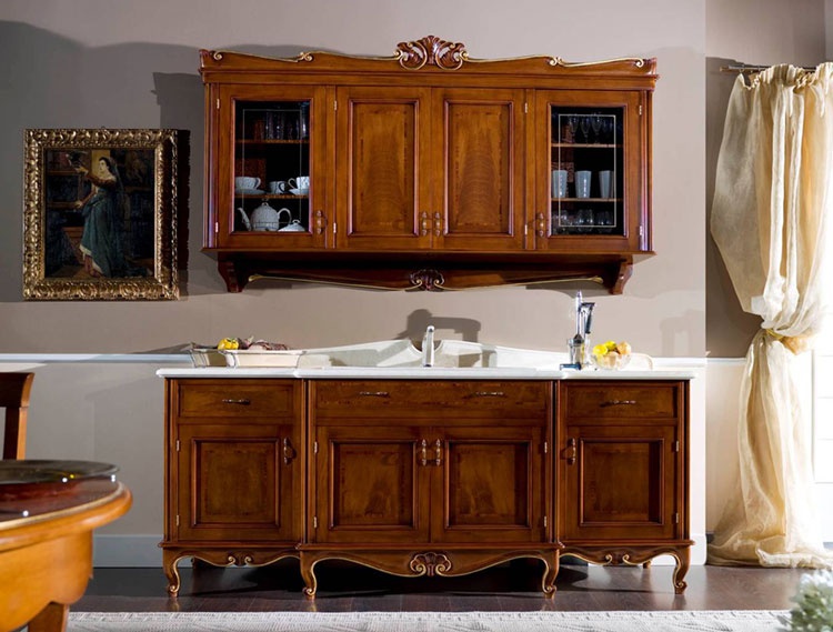 Set for the kitchen from Italian manufacturer Lubiex. Model with a number of mounted and floor lockers. Body and legs made from solid wood. Sash glazed and deaf. Accessories metal. Decoration is the decorative carving handmade.