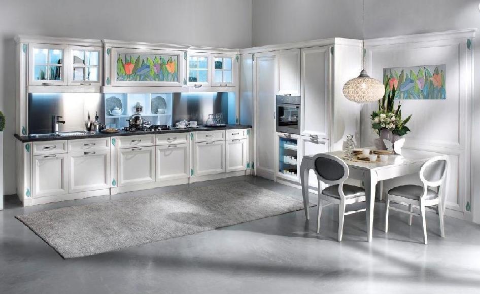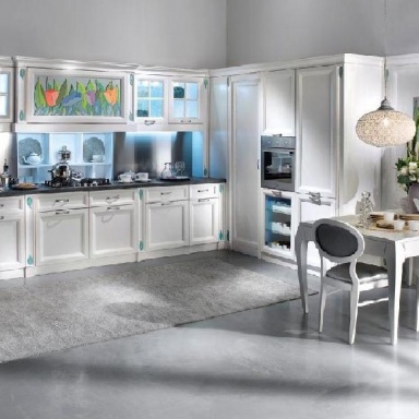 Set for the kitchen from Italian manufacturer Lubiex. The model is made in a modern style. The body is made of solid wood. The surface is painted white. Fold the top of the glass boxes. Accessories metal. Built in illumination. In addition, you can acquire dining table and chairs of similar design.