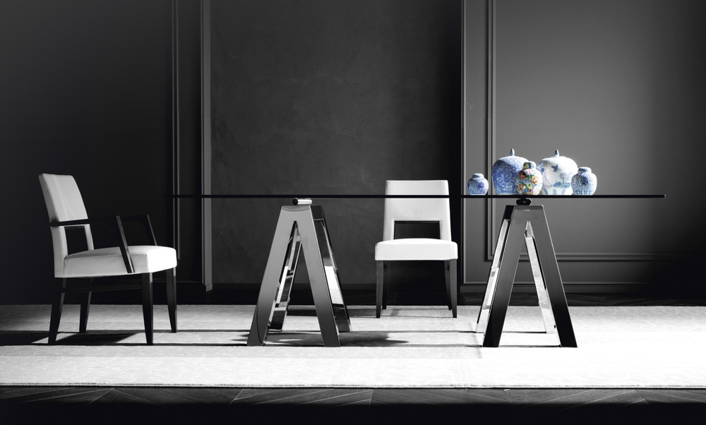 Stile dining table from Italian manufacturer Pietro Costantini. The table-top of rectangular shape made of glass. Model on a metal surface. The table is made for modern interiors. It is notable for originality of design and elegance. Colours in stock.