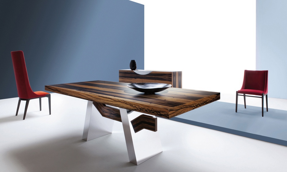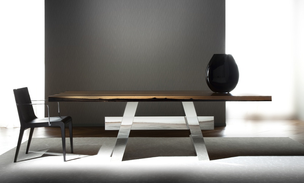 Vero dining table from Italian manufacturer Pietro Costantini. Model on a metal surface. Table top in rectangular shape is made of solid wood. The table is made for modern interiors. It is notable for originality of design and elegance.