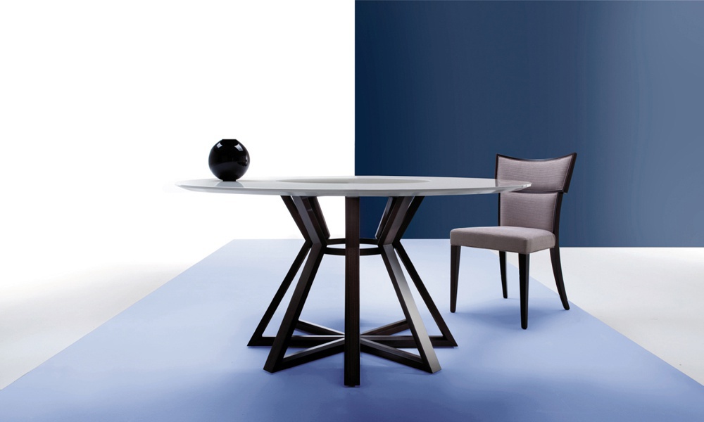 Maestro dining table from Italian manufacturer Pietro Costantini. Legs are made from wood. Countertop round shape made of glass. The finish offers a glossy varnish. The table is made for modern interiors. It is notable for originality of design and elegance. Colours in stock.