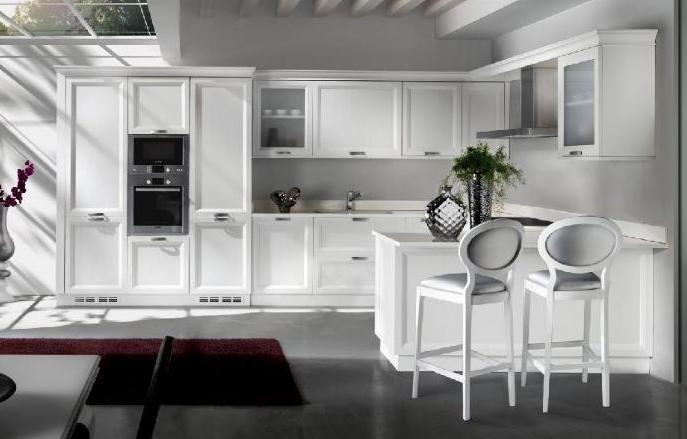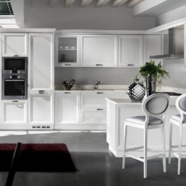 Set for the kitchen from Italian manufacturer Lubiex. Corner model. Body and fronts made from solid. Finish - white lacquer. Sash glazed and deaf. Accessories metal. Made in a modern style.