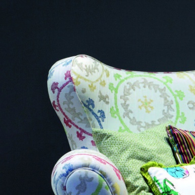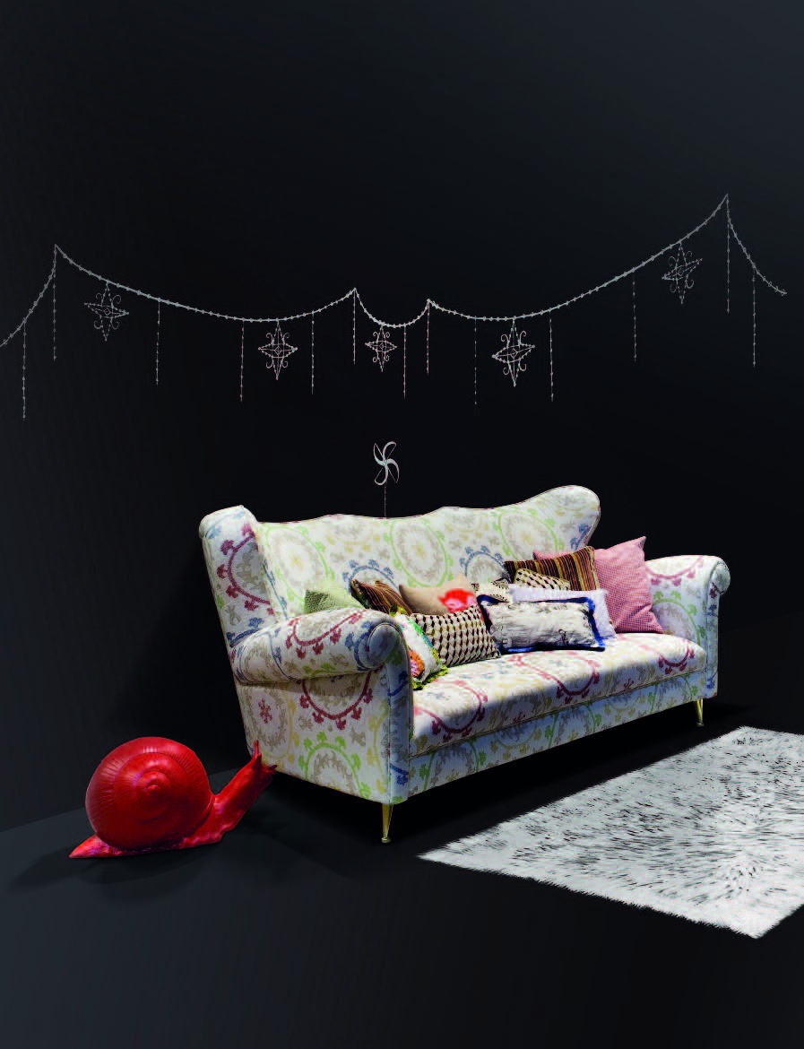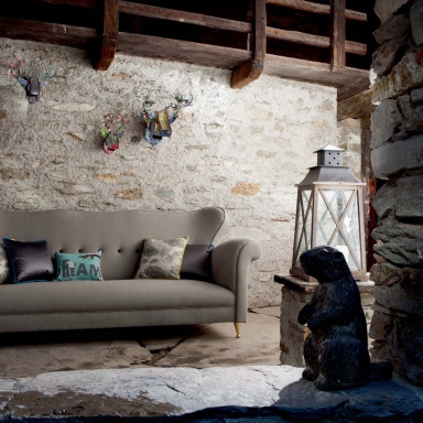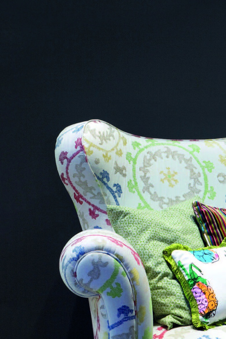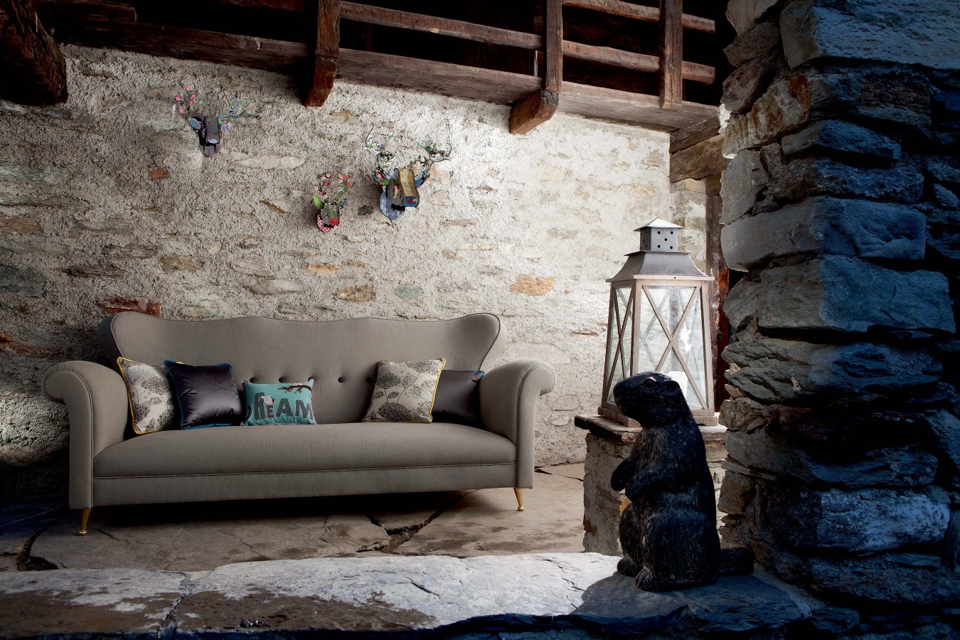 Peppino three seater Sofa from Creazioni Italian manufacturer. The frame is made from solid wood. The back is embellished with decorative buttons. For upholstery, can be used copyright fabric with hand painting. Gorgeous triple model for the living room. Colours in stock.