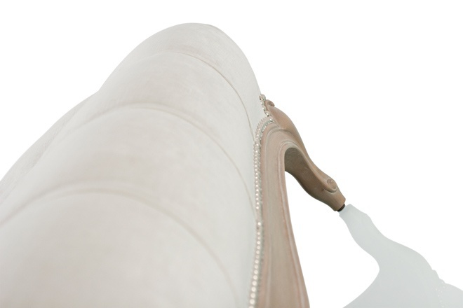 Bench Moli from Belgian producer JNL. The model square. Legs low figure shape. Material - solid wood. Finish the catalog of the company. The seat is covered with white textile. Made in a classic style.