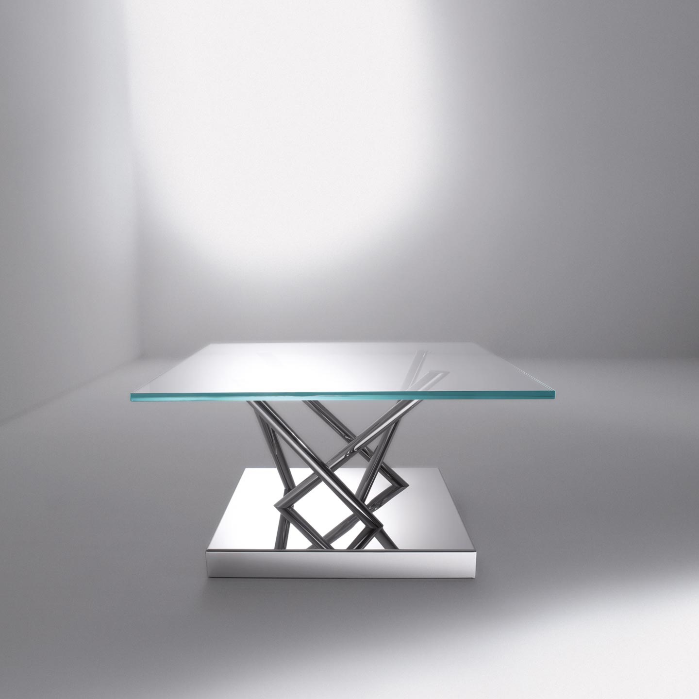 Table Sottsass from the Italian manufacturer Laurameroni. Model on a frame of chromed steel. Worktop - tempered glass. A lovely choice for dining room design decoration. Colours in stock.