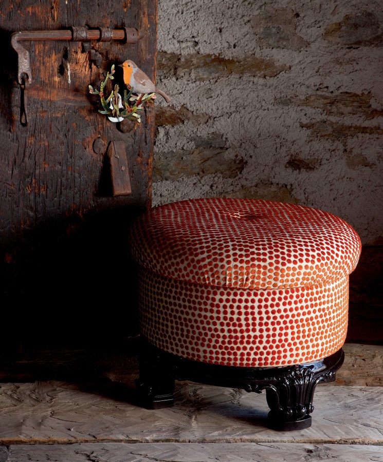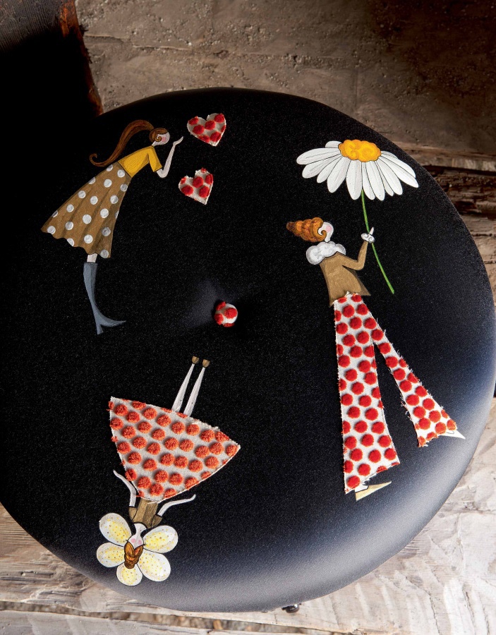 Round Pouf Pat from the Italian manufacturer Creazioni. The model is made in modern style. The frame and legs are made of solid wood, finished with varnish. Upholstery textiles or leather from the company portfolio. Colours in stock.