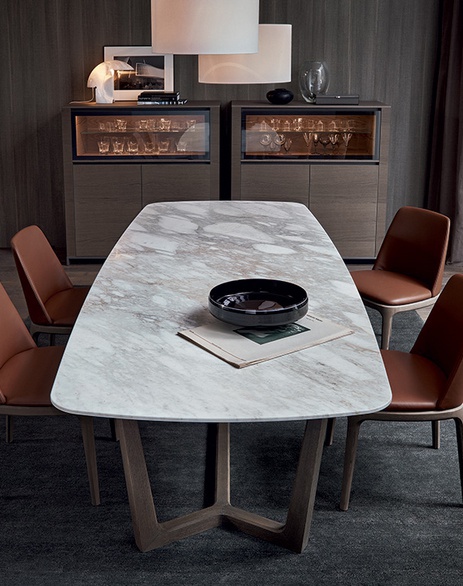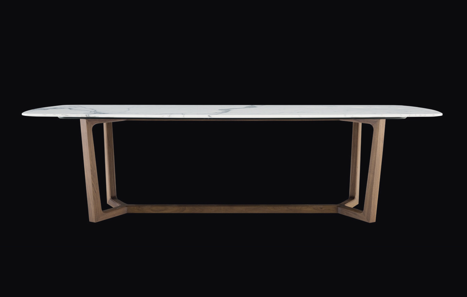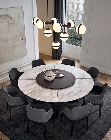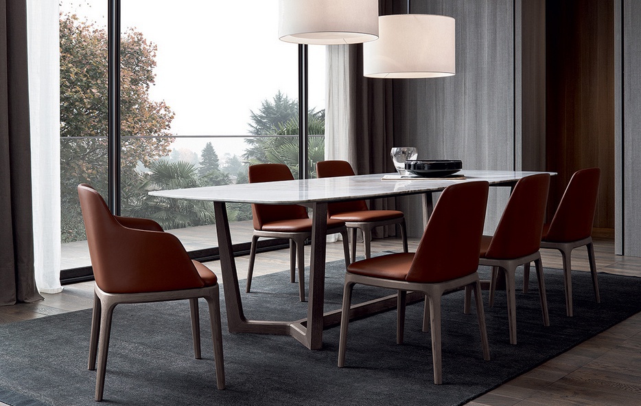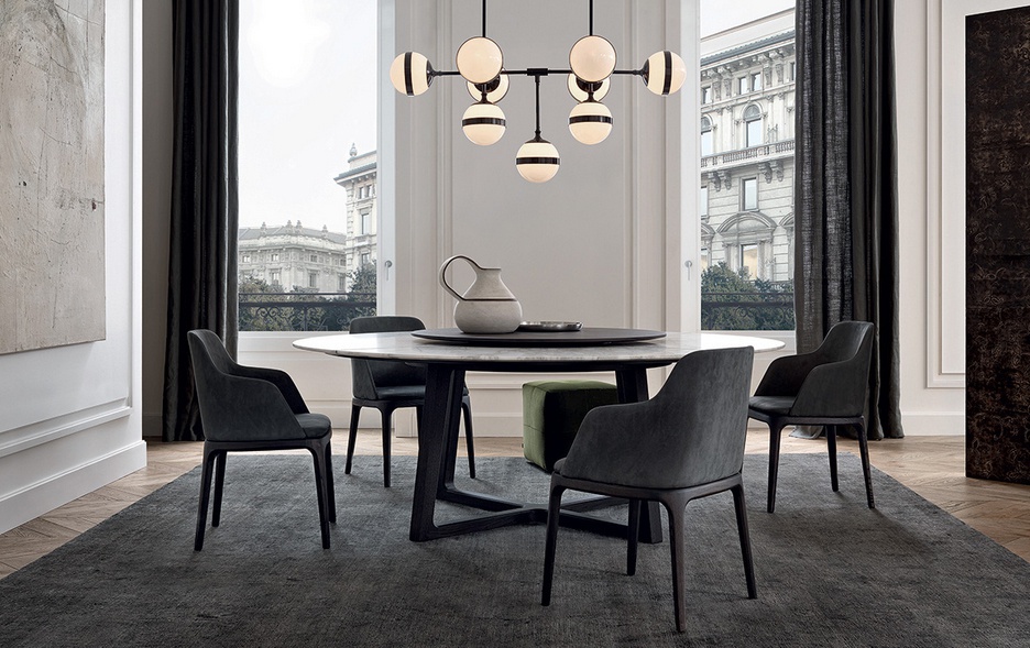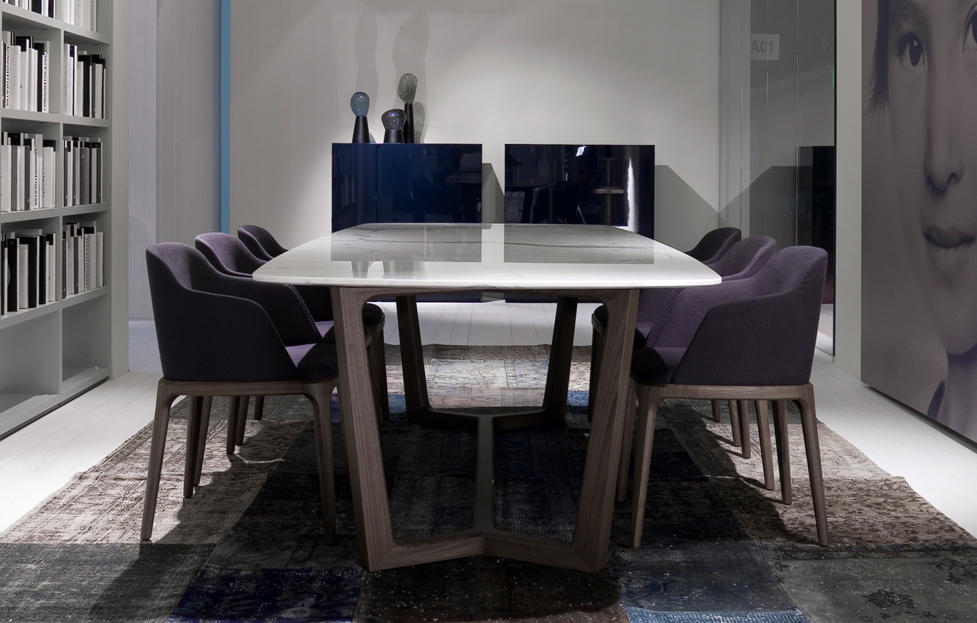 Concorde dining table from Italian manufacturer Poliform. Designed by designer Emmanuel Gallina in 2009, the model is gaining popularity. The apparent simplicity of form is balanced by natural materials and attention to detail. Legs and base are made from solid wood; soft forms emphasize its naturalness. Table top marble rectangular or round shape. Available in black or white veined marble. The perfect solution for any modern interior. Colors and finishes in stock.