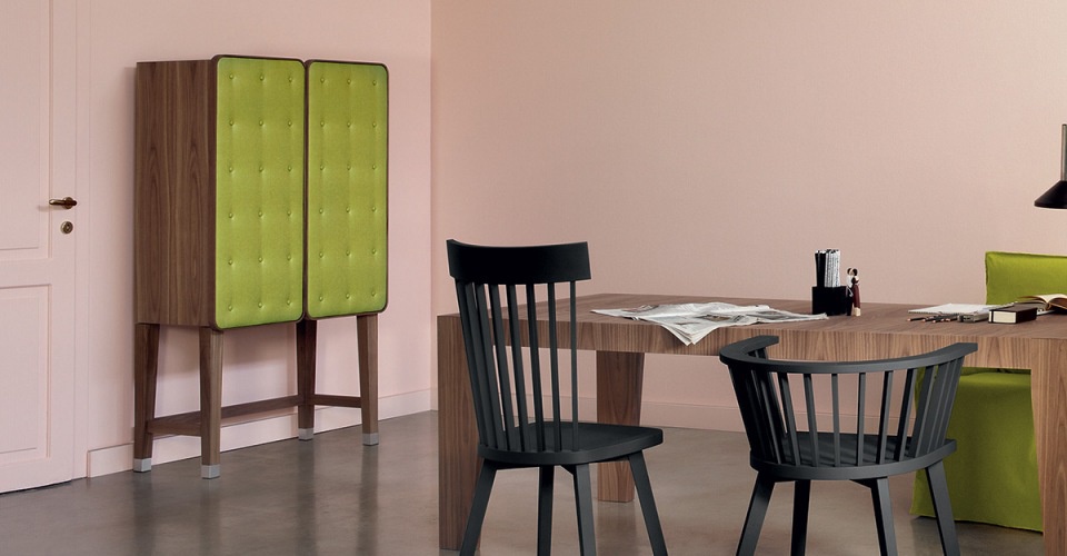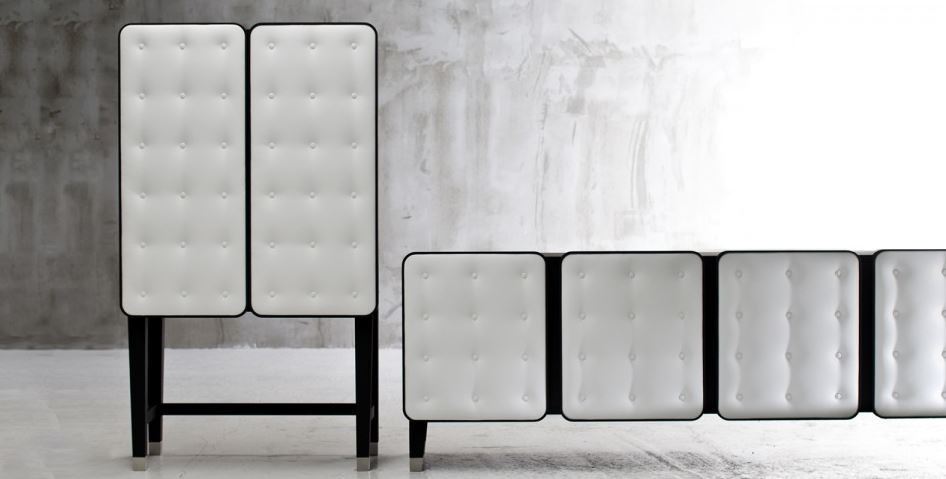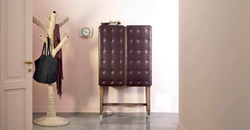 Cupboard Brick 85, from the Italian manufacturer Gervasoni. The frame is solid walnut. The doors are upholstered in textiles. Design model for the modern interior. Colours in stock.