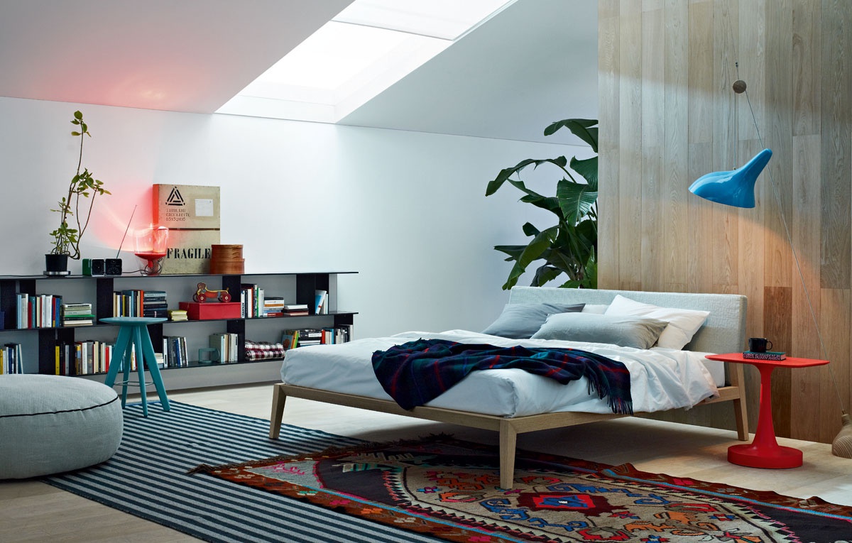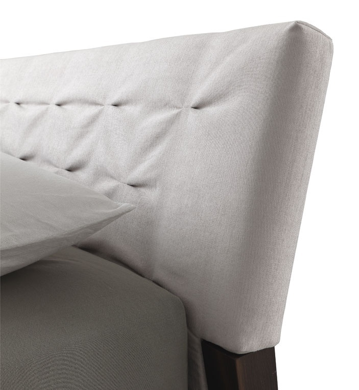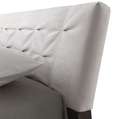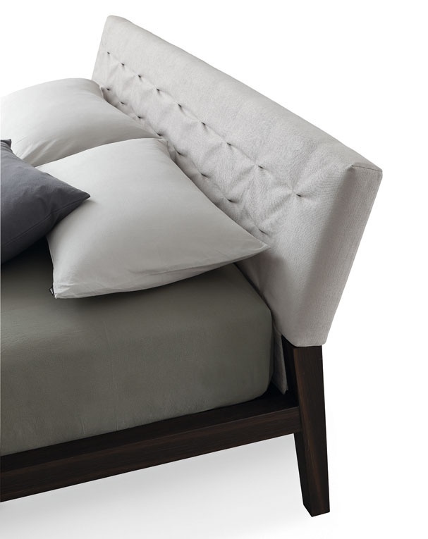 Aton double bed from Italian manufacturer Poliform. The model is made in modern style. The frame and legs are made of solid wood. Finish the catalog of the company. Low headboard covered with white textiles.