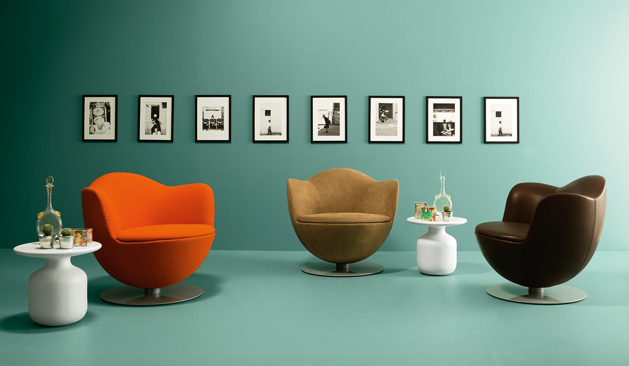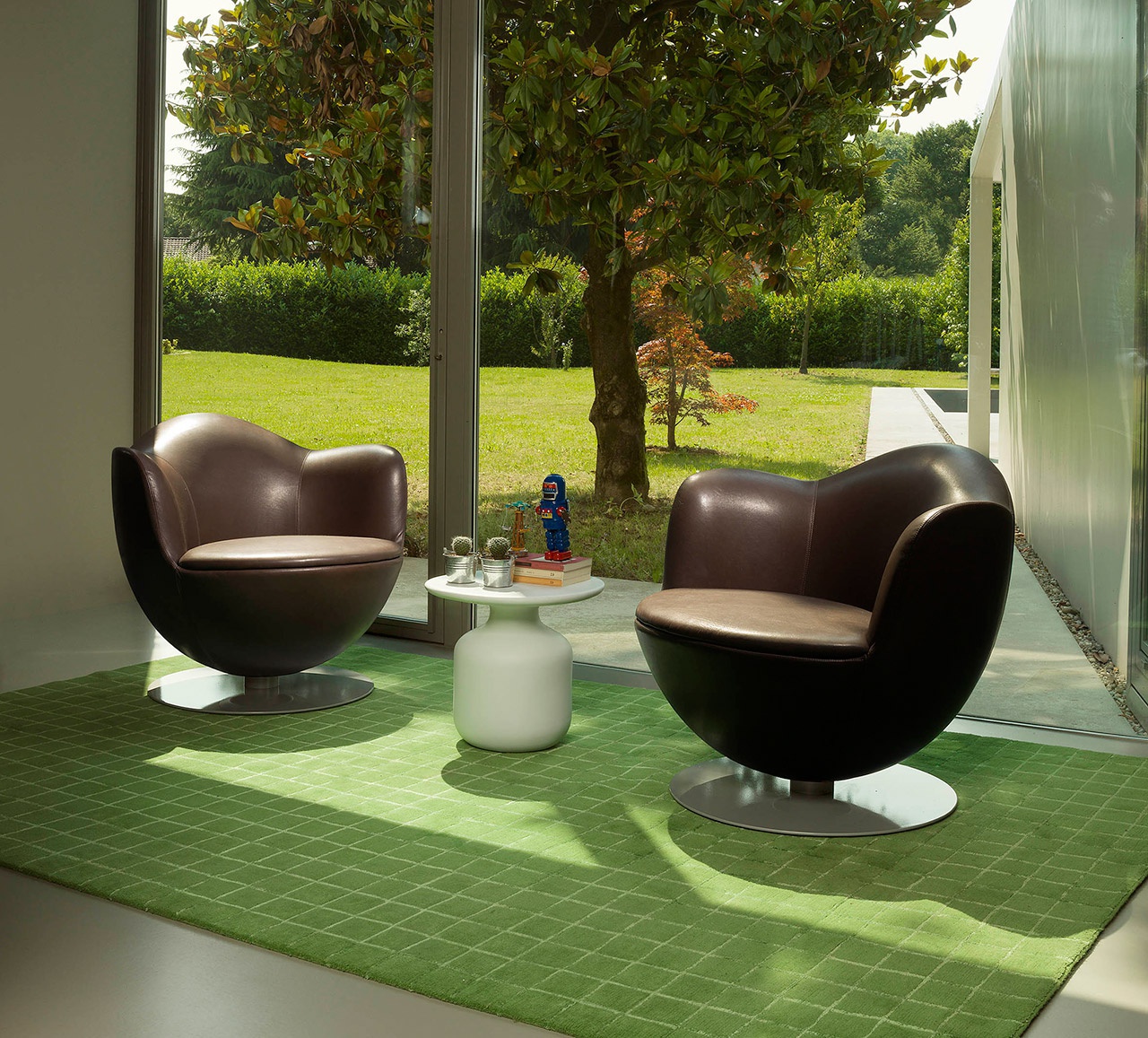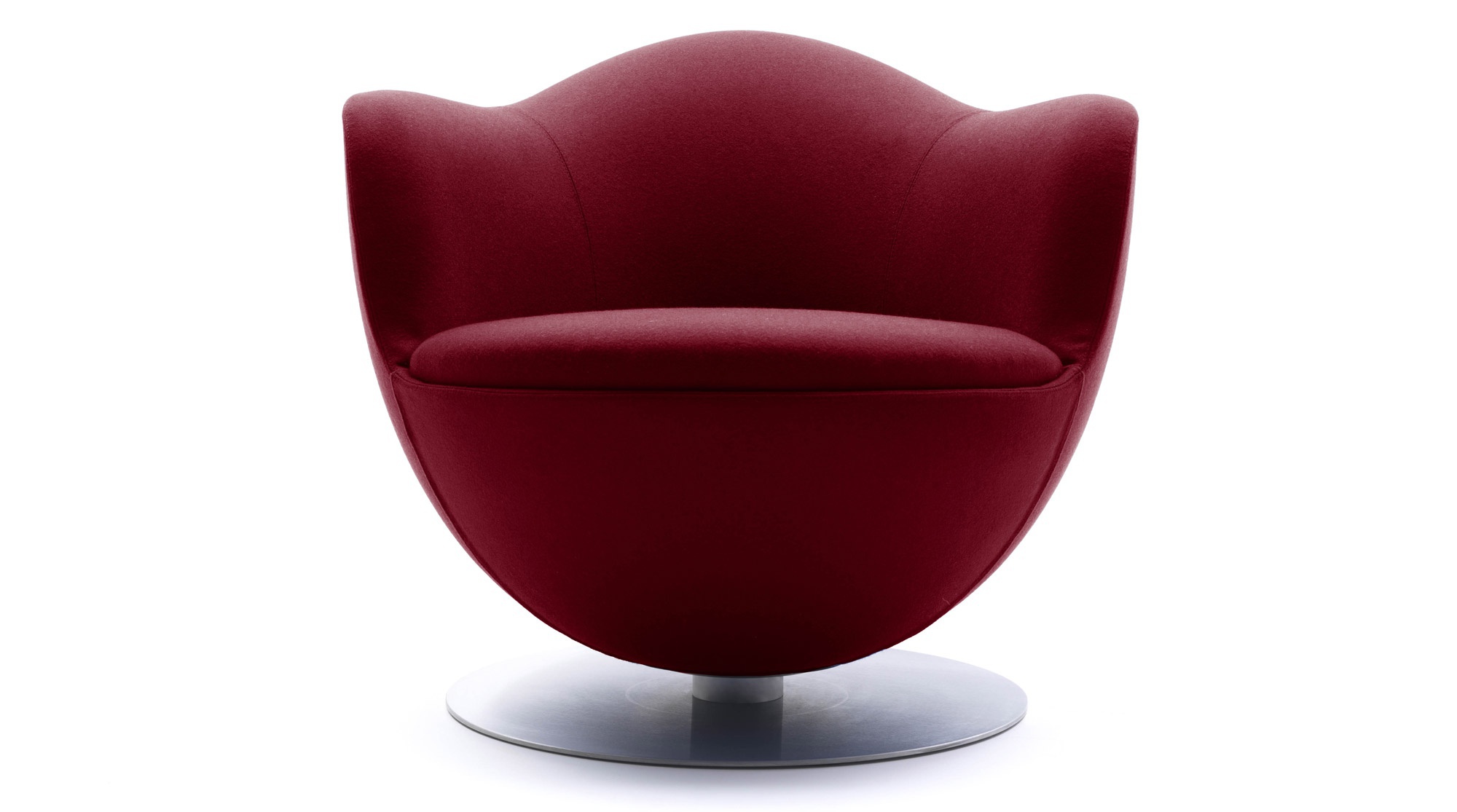 The Dalia chair from the Italian manufacturer Cappellini. Model on a swivel base made of metal. A poetic and contemporary armchair reminiscent of the flower whose name it bears. The body is made of fiberglass and resin, and the seat and back are composed of polyurethane foam. Upholstery of textile or leather. Colours in stock.