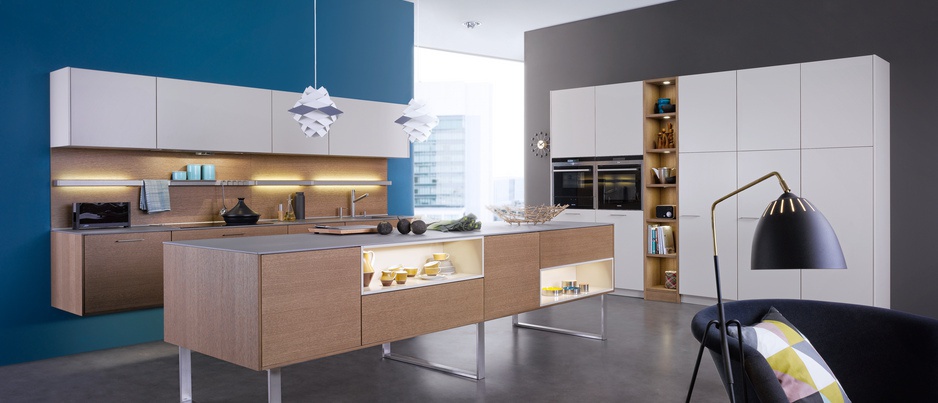 Set for the kitchen from the German manufacturer Leicht Kuechen AG. The model is made in modern style. Includes island Cabinet and system out of several modules. Material - solid wood and metal. Finish option to be selected from a catalog company. Built in illumination.