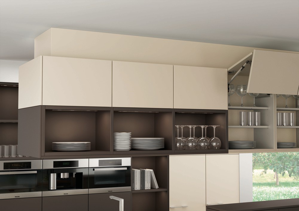 Set for the kitchen from the German manufacturer Leicht Kuechen AG. The model is made in modern style. Includes a system mounted and floor lockers and drawers. Material - solid wood and metal. Finish glossy lacquer brown and mocha. Built in illumination.