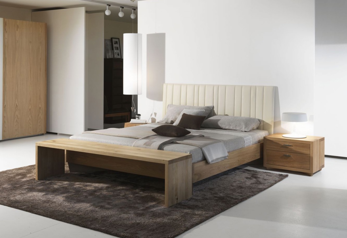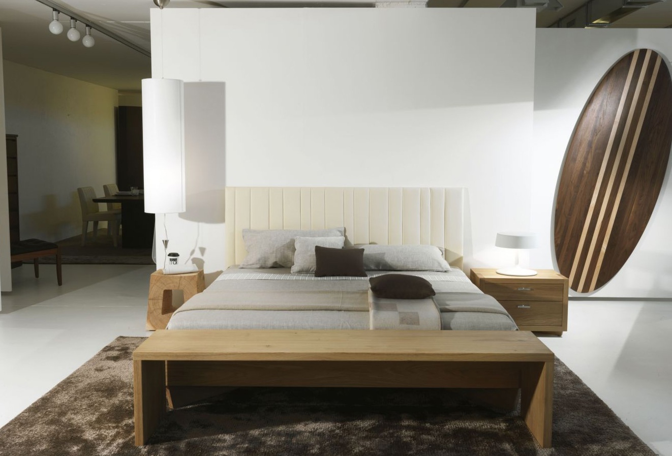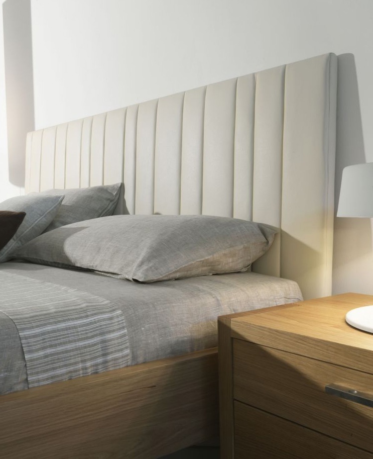Double bed close to Villa Melzi from the Italian manufacturer Riva 1920. Bed with high headboard, made from solid wood. Upholstery - textiles. The style is modern. Colours in stock.