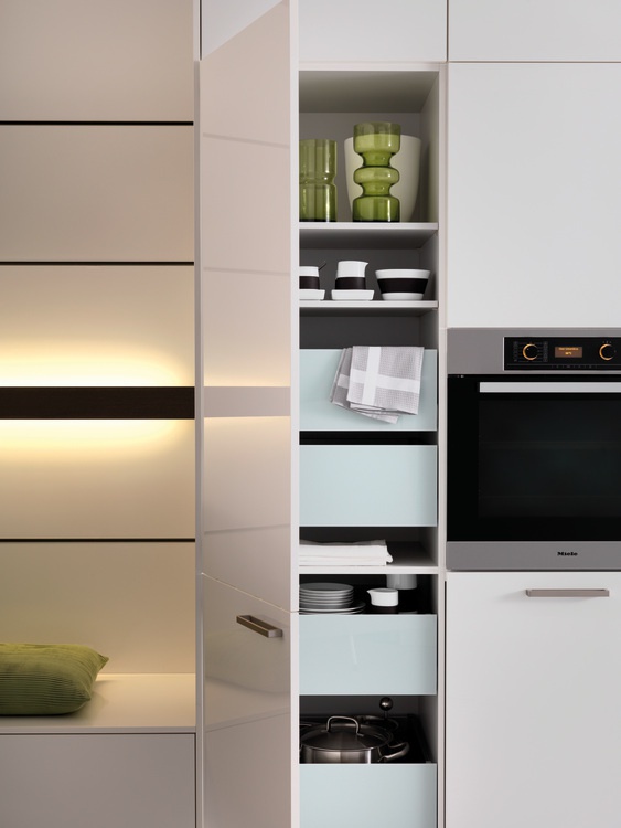 Set for the kitchen from the German manufacturer Leicht Kuechen AG. Includes island and system cabinets for storage. Material - solid wood. Accessories metal. Finish to be selected from a catalog company. The augmented model with built-in lighting.