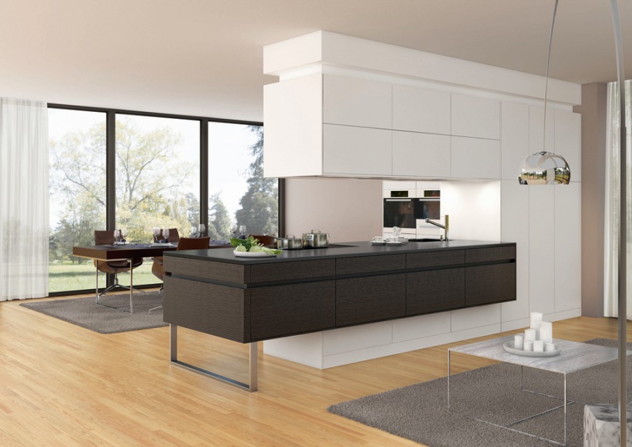 Set for the kitchen from the German manufacturer Leicht Kuechen AG. Model with island and hanging from the ceiling in sections. Material - solid wood and metal. Countertop made of natural stone. The finish offers a matte or high gloss lacquer finish.